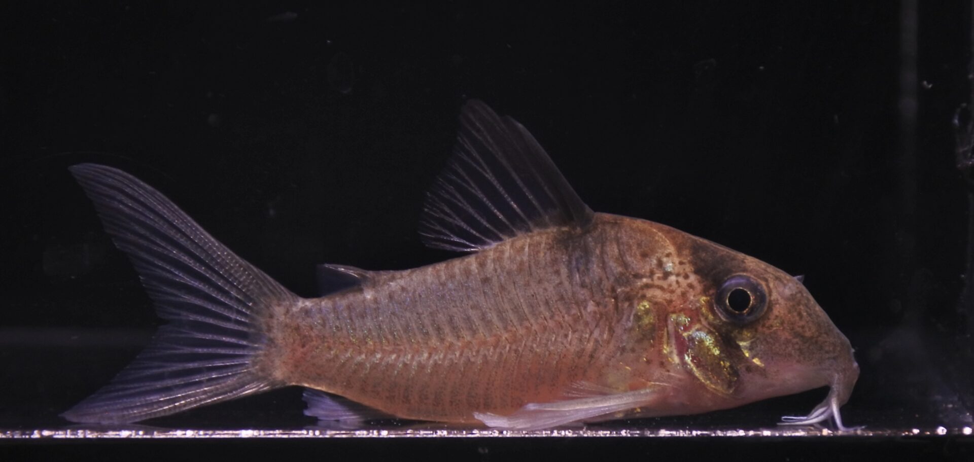 肩口の黒班とボディのミストスポットが美しいスリナムロングなコリドラス。